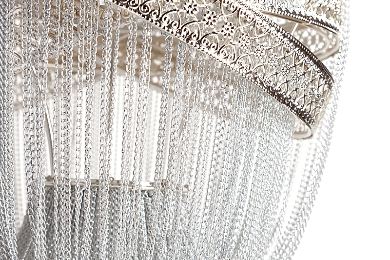 Люстра Guadarta Largento Серебро. Роскошная люстра GUADARTA LARGENTO Серебро из множества металлических цепочек, напоминающая своим исполнением эффектный предмет декора. Сложно оторвать взгляд от такого безупречного предмета интерьера. В люстре удачно сливаются воедино эффектная асимметрия, объемная форма, динамика и чистое серебристое сияние. Множество металлических цепочек хорошо пропускают свет, она станет отличным источником освещения небольших помещений. Длина провода 80 см. Предназначена для использования со светодиодными лампами.